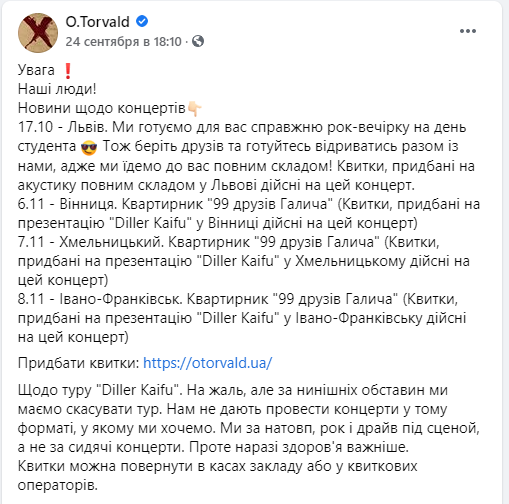 Буквально днями в офіційній групі колективу з’явилася непоказна пара рядків наприкінці основного посту про майбутні концерти, в якому ми дізналися наступне: