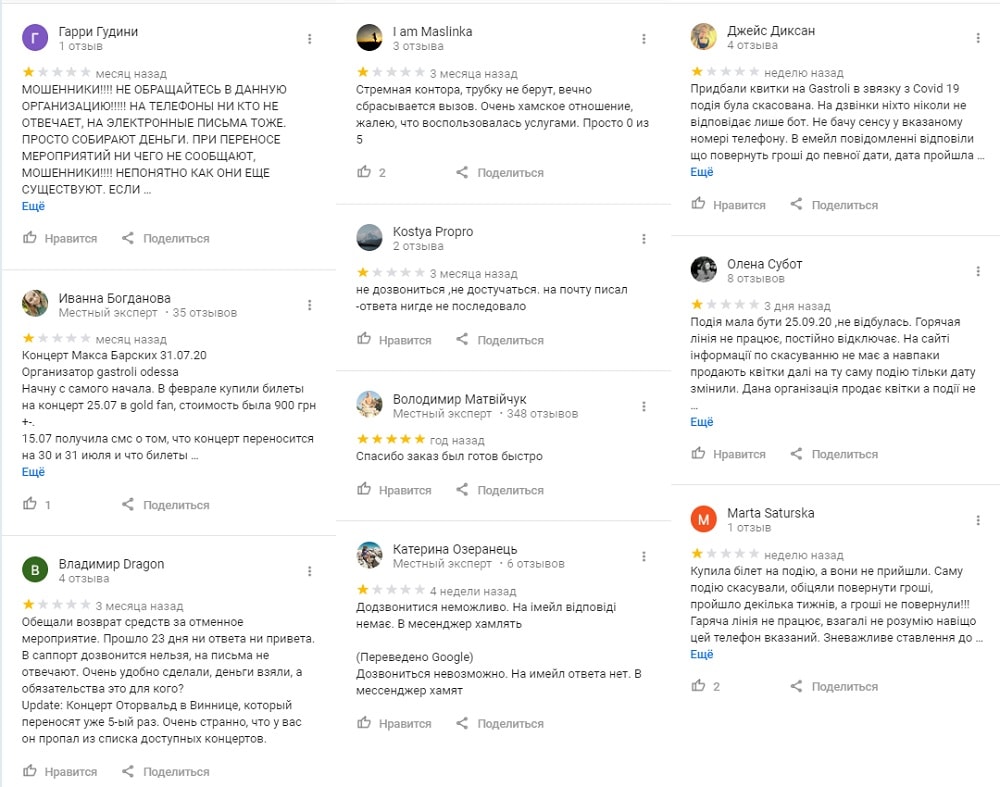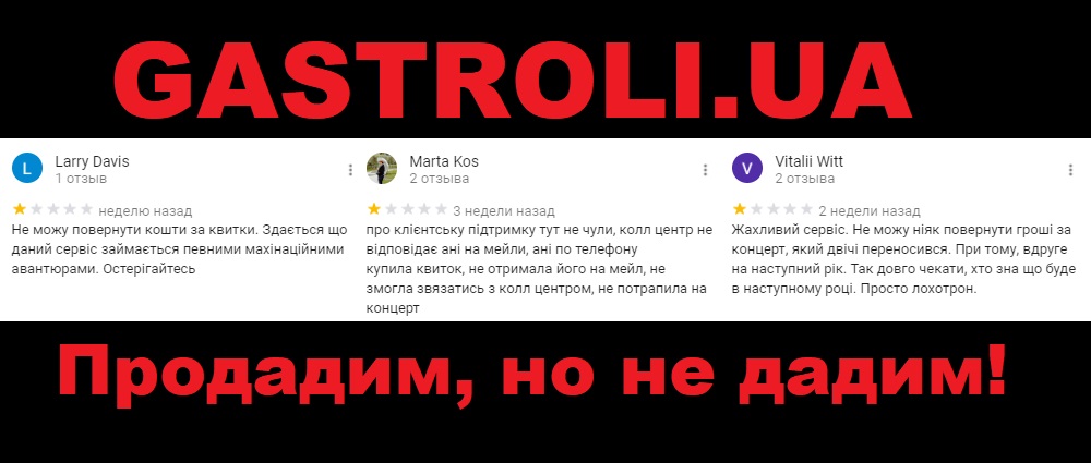 І ось тут трапився дрібний, але особливо неприємний момент. Квитки було куплено на одному сайті. Чи часто ви звертаєте увагу на те, де купуються квитки? Я не надто. Як виявилось, квитки були куплені на сайті gastroli.ua, які, як мені здавалося, часто продають квитки на різноманітні заходи. Щоб зрозуміти про що піде подальша історія, давайте я вам просто покажу скрін відгуків з Гугла