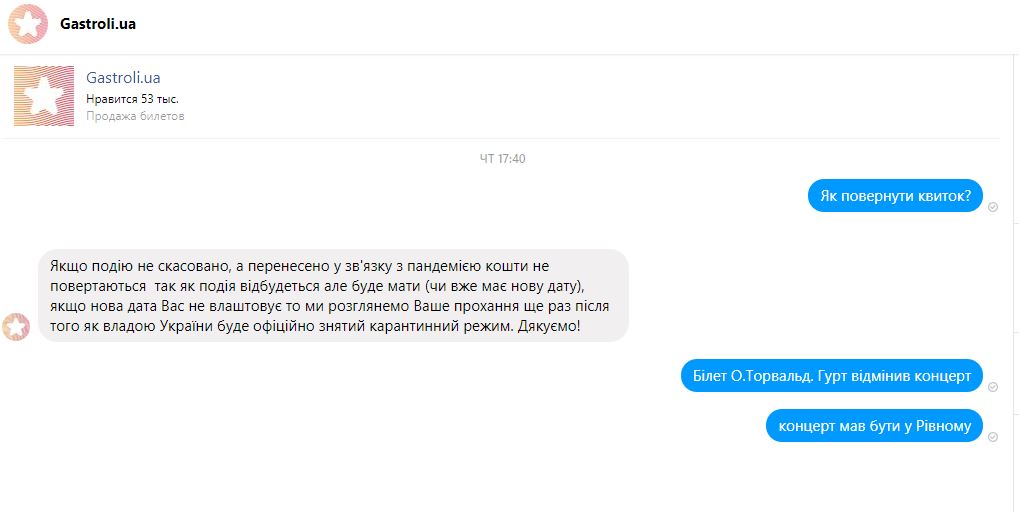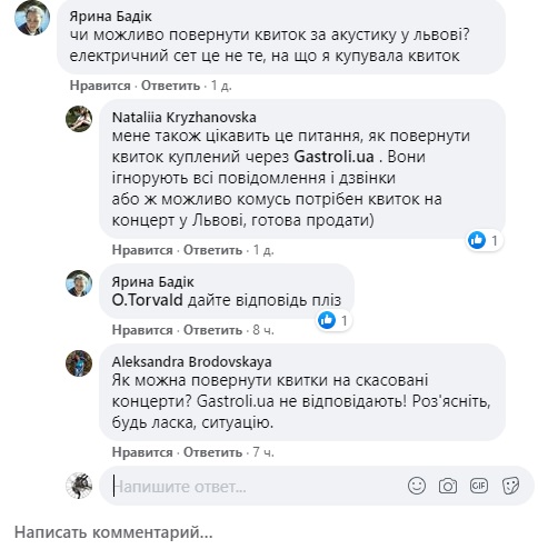 Конкретно в даному випадку у мене питання навіть не до когось конкретно, а одразу до двох суб’єктів – того, хто продає квитки і не виходить на зв’язок, а також до того, хто уклав договір із цим розповсюджувачем квитків, тобто безпосередньо до самої групі – у чому проблема повернути гроші, які були сплачені за захід, що не відбулося з вашої вини? Це не форс-мажор, оскільки карантин запровадили ще до фактичної дати проведення початкового концерту. Це не прохання повернути гроші за перенесений концерт, на який я не зміг дістатися. Це не бажання повернути гроші за квиток, який виявився мені не потрібним. Я хочу отримати гроші за послугу, яка за фактом не була надана.