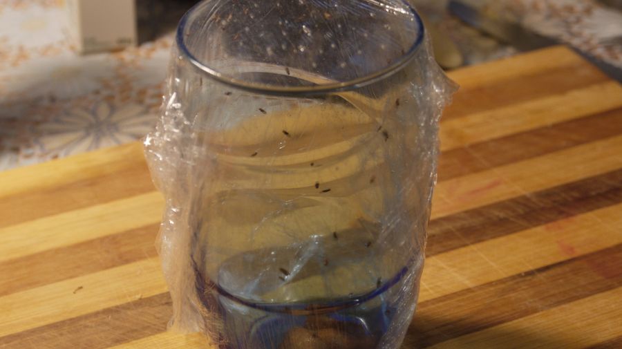 Рецепт полягає в тому, щоб покласти на дно склянки фрукт, який запахом залучатиме мошок. У плівці, якою ми обертаємо склянку (у пластиковий відео, ми використовували звичайний скляний), робимо за допомогою голки або, що краще, зубочистки (отвори будуть ідеального діаметру) дірки. Потрібно зробити близько 10-12 отворів, щоб мошки могли без проблем туди залізти.