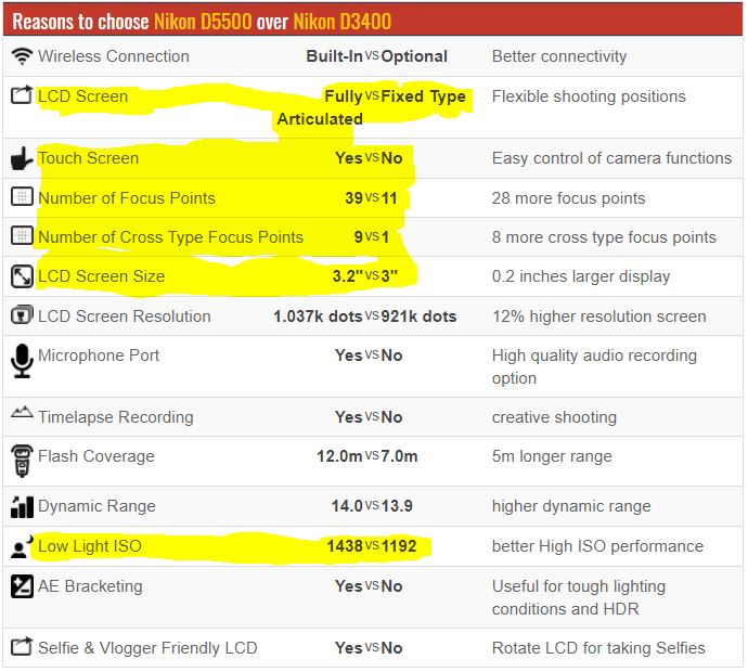 Для порівняння D3400 у D5500 я зробив скріншот, у якому виділив найбільш актуальні для мене відмінності