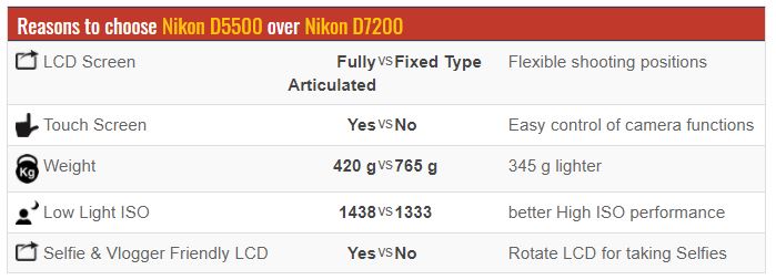 Плюси тут, в основному, ті ж, крім ваги, яка нижче майже в 2 рази. Якість знімків, за багатьма відгуками, у D7200 і D5500 схоже, а значить якщо нам не потрібно те, що може запропонувати саме D7200, то більш дешева камера стане чудовим варіантом.