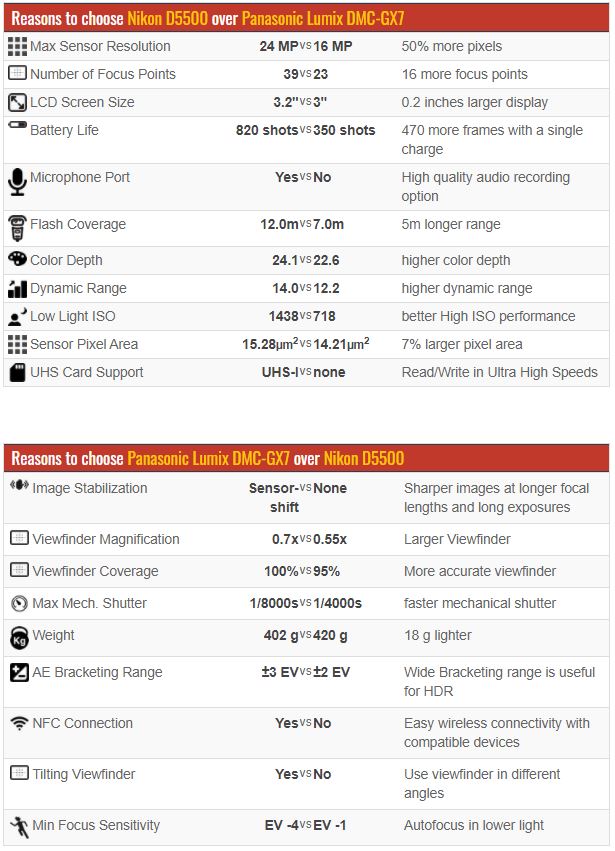Nikon D5500 має приблизно вдвічі більш високе “робоче ISO”. Кількість кадрів, яку можна зробити на одному заряді, також приблизно в 2,5 рази вище. При цих перевагах, вага повноцінної дзеркальної камери, з більшою в 1.6 разів матрицею, вище лише на 18 грам . Заради об’єктивності, кількість мегапікселів у Nikon на 8 більше, ніж у середньостатистичної камери на байонеті micro4/3, а саме 24 проти 16. І хоча, з точки зору різкості кадру, Panasonic буде більш актуальним, але можливість зробити у Nikon кроп з 24 до 16 мегапікселів з потрібним шматком кадру є незаперечною перевагою.
