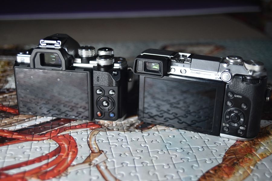 Знову ж таки, якщо порівнювати лоб у лоб, то похилий видошукач у GX7 має значну перевагу перед видошукачем, розташованим по центру маленької тушки E-M10 – чи то у мене ніс великий, чи то людям з більшою мордою обличчя, ніж у мене таке розташування буде ще більш незручним. Це красиво на дзеркальних камерах, але зовсім не застосовується на таких компактах.