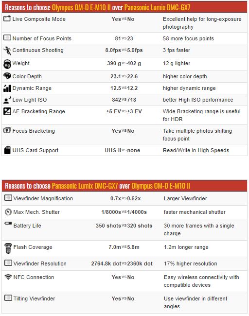 Справа в тому, що серед бюджетних камер саме у E-M10 Mk2 є найбільш повноцінний електронний затвор серед камер Olympus. У першій E-M5 його не було (хоча технічно міг би бути такий самий, як у E-M1), у першої E-M10 його не було (хоча вона вийшла після E-M5 та E-M1). У наступній версії його урізали, унеможлививши знімати таймлапси в “економному” (для механічного затвора) режимі. Тому E-M10 Mk2, що чисто технічно є конкурентом нижчої лінійки (GX80), в оновленому вигляді конкурує з камерою, яка за своєю суттю ближче до E-M5. Пропоную поглянути на характеристики у більш зрозумілому вигляді: