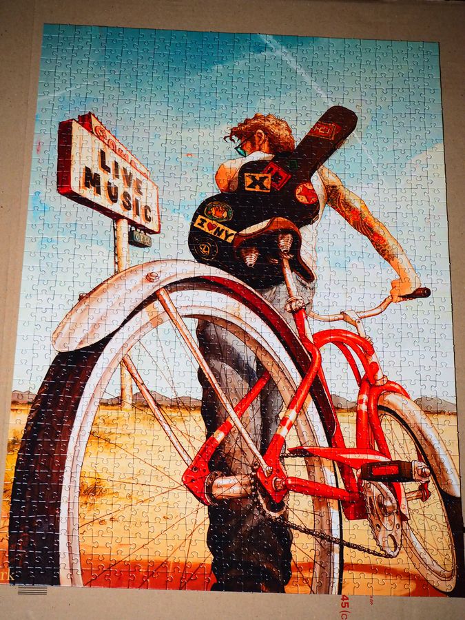 Сам собою велосипед збирався аж двічі. Перший раз, коли ми збиралися переїжджати, а вдруге вже безпосередньо зараз. Переїзд найближчим часом нам не світив, було прийнято рішення повернутися до пазлів – усіляко цікавіше перевозити зібрані картини, ніж коробки (насправді ні). Безліч деталей в даному випадку не полегшувало, а скоріше навіть ускладнювало складання – як і наявність двох схожих місць зі спицями та елементів, які займали досить великий простір (гітара). І все-таки це була картинка, що мені подобається, тому і збірка її була порівняно недовгою, але приємною. Зображення було складено днів за 4-5 повільної роботи. Кінцевий результат дуже доставив своїми яскравими та насиченими квітами.