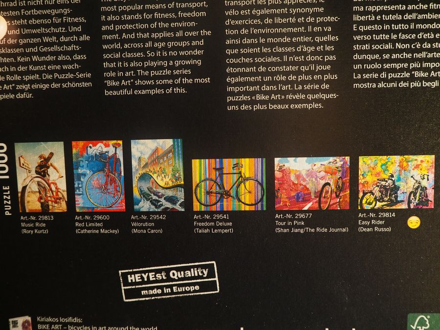 Як фанату велотеми, мені дуже зайшла ця картинка, і…як фанату, зокрема, круїзерів – думаю не дуже складно здогадатися, чим саме зайшла. Велосипеди не рідко зображують на пазлах, але цей мені дуже нагадав деякі моделі тих же Felt’ів, тому дуже захотілося мати одну таку роботу у себе на стіні. У Heye в даній серії є кілька робіт, кожну з яких можна побачити на звороті коробки.