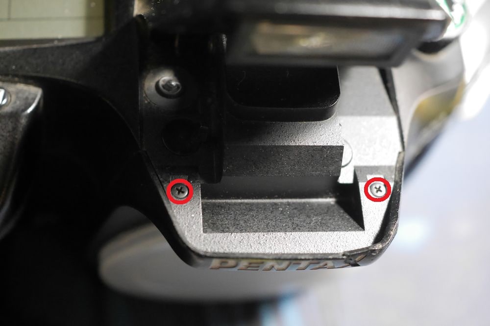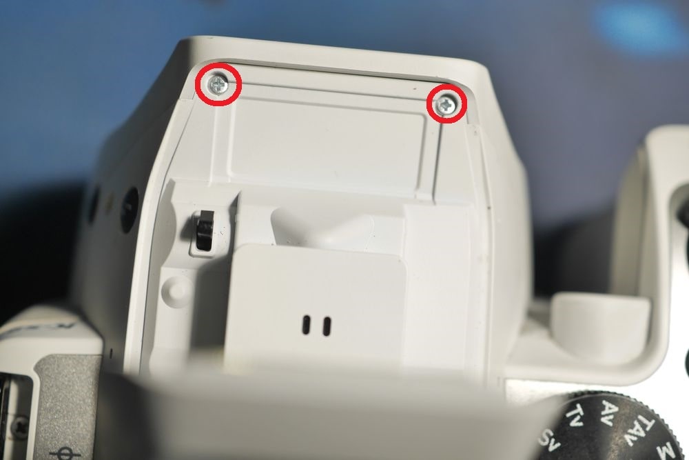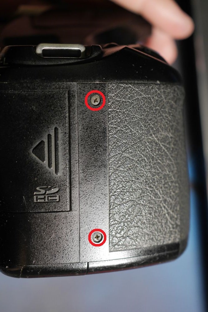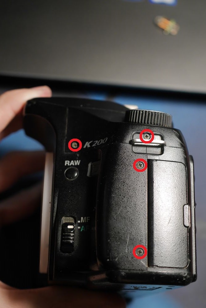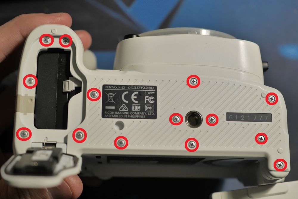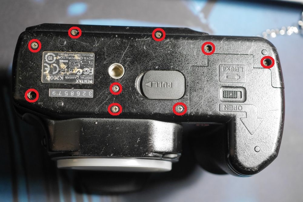 Для вашої зручності я відзначив червоним болти, які обов’язково слід викрутити при розбиранні фотоапарата. Спочатку болти для зняття основного блоку