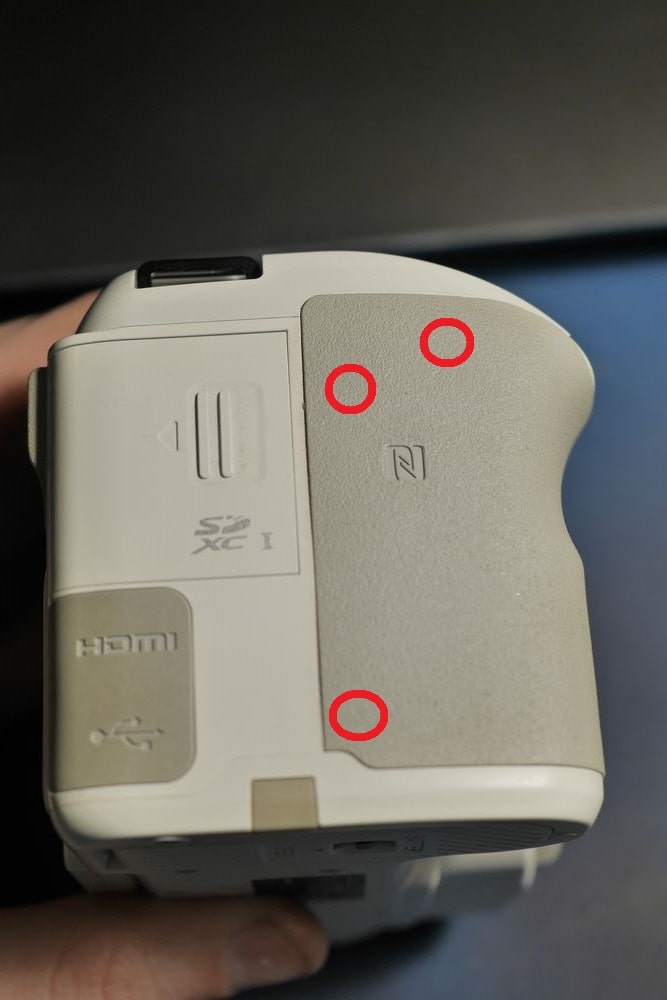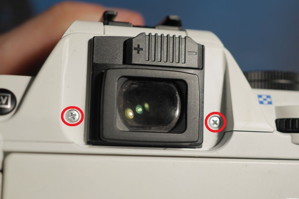 Для вашої зручності я відзначив червоним болти, які обов’язково слід викрутити при розбиранні фотоапарата. Спочатку болти для зняття основного блоку