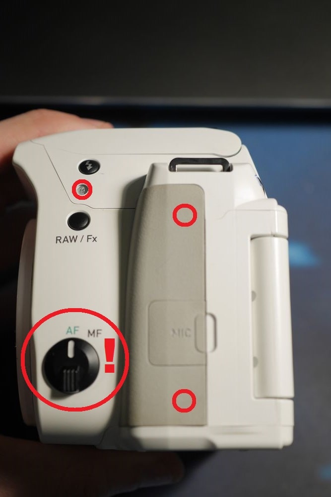 Як ви могли помітити, тут помічені всі болти, у тому числі ті, що відносяться до верхньої панелі. Розібрати фотоапарат без знімання верхньої панелі неможливо. На одному з фото велике коло зі знаком оклику – перед тим як знімати передню панель, варто перевести перемикач автофокусу в режим ручного фокусування (М). Це викликано розташуванням перемикача на самій платі, щоб передню панель було зручніше зняти та встановити назад.