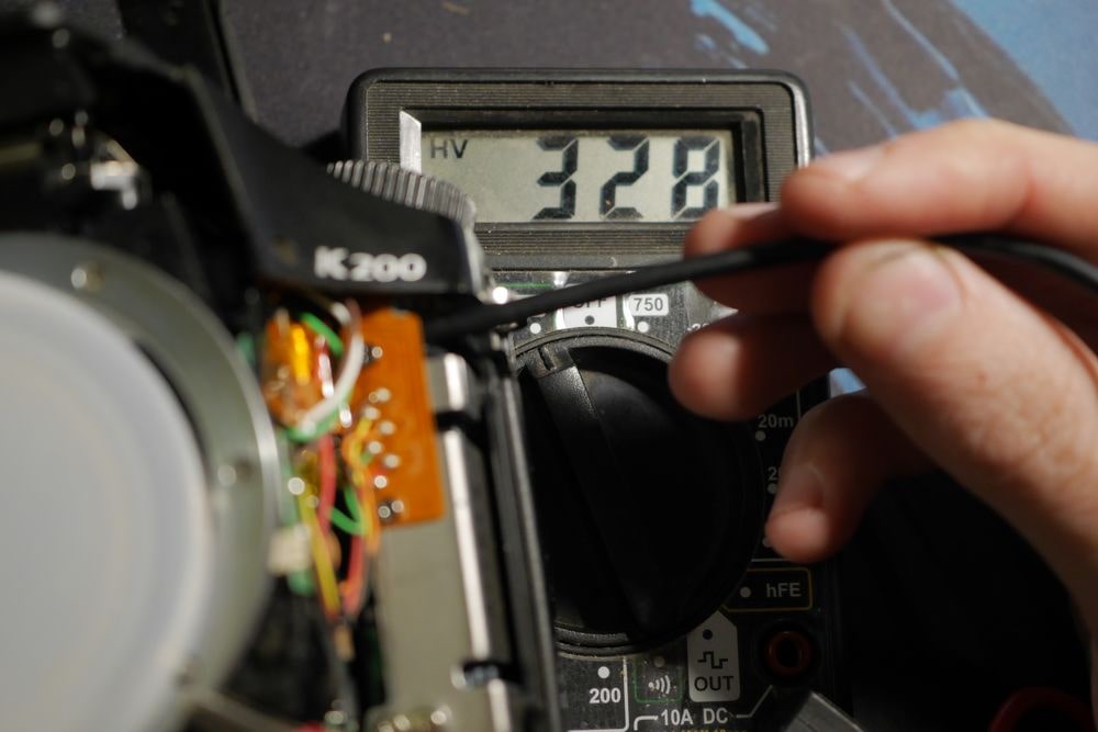 Спочатку перевіряємо наявність напруги на конденсаторі. Для цього підключаємо мультиметр один щуп до байонета (мінусовий контакт), другий до плюсового контакту конденсатора спалаху.