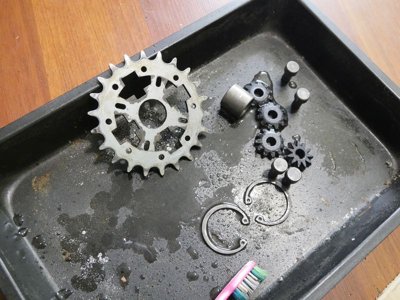 Планетарна втулка була почищена від бруду. У саму конструкцію лізти не став, оскільки і досвід і вартість цієї планетарки на вторинному ринку говорять мені, що поки працює нехай працює, а там простіше буде поміняти на щось свіже. За деякий час до розбирання велосипеда у мене стався дивний одвірок – коли я виїжджав на дорогу і зусиллям крутив педалі – у мене їх заклинило і я не зміг їхати. Ситуація склалася не з приємних, довелося їхати всю дорогу мотором. Подумав, що щось не так із планетаркою. І мав рацію. Частково.