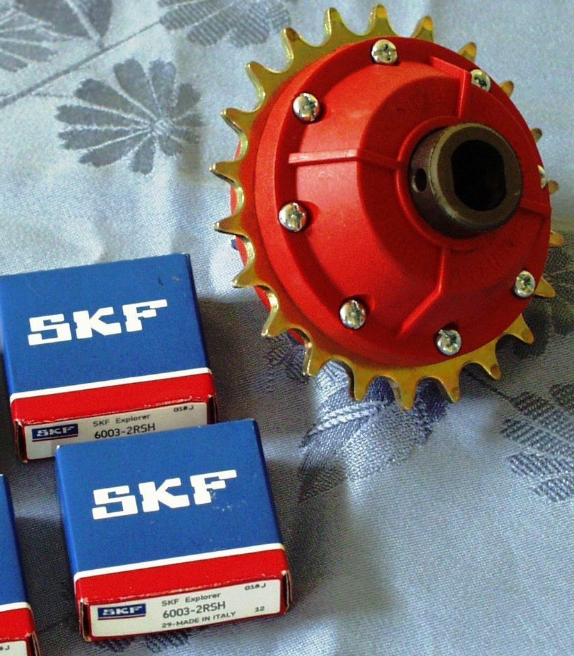 Підшипники фірми SKF моделі 6003-2RSH . Справа в тому, що ці підшипники складно було знайти де-небудь за місцем, довелося замовляти через інтернет. Вони мають злегка нестандартні розміри, отже брати бажано такі самі. Вартість кожного близько 4 у. По ідеї можна взяти більш дешеві з тими ж параметрами по 1 у.о., але тут вже господар пан, а я взяв ті, що гарантовано підійдуть. До того ж ходова частина велосипеда не те місце, де варто економити на підшипниках.