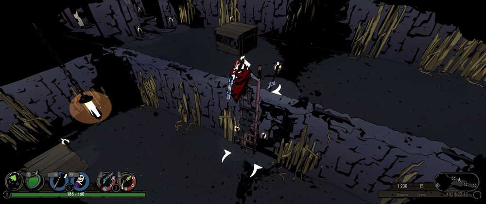Мені подобаються ігри, де управління зроблено з розуму. Тобто у тебе не виникає запитань, чому перекат або використання здібностей знаходяться на якійсь конкретній кнопці – ти думаєш “мені потрібно це”, і пальці самі знають куди тягтися – саме так зроблено управління в West of Dead. Тут ще дається взнаки особливість геймплея. Якби можна було назвати це жанром, то я б сказав що це “коридорний шутер” з slow-motion стискання в дусі Max Payne. Від куль ворогів нам доведеться ховатися за укриттями, куди ми можемо залетіти перекатом. Вдало зроблений перекат (коли ворог вистрілив, але ти до влучення кулі встиг натиснути кнопку перекату) викликає той самий ефект уповільнення, під час якого ти можеш прицілитися у ворога і наповнити його свинцем тушку. Коли я тільки почав грати, мені здалося, що якось воно все простенько і миленько. І все було так, поки я не зрозумів, що в налаштуваннях спочатку включено опцію “допомоги в прицілюванні”. Її ненав’язлива робота створювала відчуття, ніби я найвлучніший хлопець на селі, але після відключення прийшло розуміння, що це далеко не так. Ходьба виведена на лівий стик, тоді як правий відповідає за прицілювання. Локації темні, вороги ледь помітні, і тут нам на допомогу приходить ненав’язливе підтвердження мети у вигляді кола під ворогом. АЛЕ! Усі локації виконані у затемненому вигляді. Щоб побачити ворога, нам потрібно запалити ліхтар (встигнувши до нього добігти). І тільки після цього це “підтвердження мети” запрацює. Ходьба виведена на лівий стик, тоді як правий відповідає за прицілювання. Локації темні, вороги ледь помітні, і тут нам на допомогу приходить ненав’язливе підтвердження мети у вигляді кола під ворогом. АЛЕ! Усі локації виконані у затемненому вигляді. Щоб побачити ворога, нам потрібно запалити ліхтар (встигнувши до нього добігти). І тільки після цього це “підтвердження мети” запрацює. Ходьба виведена на лівий стик, тоді як правий відповідає за прицілювання. Локації темні, вороги ледь помітні, і тут нам на допомогу приходить ненав’язливе підтвердження мети у вигляді кола під ворогом. АЛЕ! Усі локації виконані у затемненому вигляді. Щоб побачити ворога, нам потрібно запалити ліхтар (встигнувши до нього добігти). І тільки після цього це “підтвердження мети” запрацює.