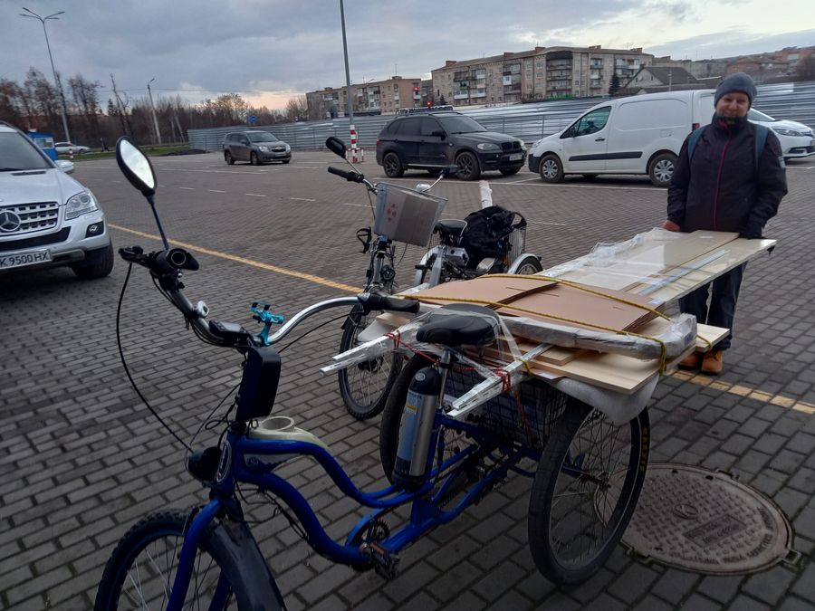 Тут мені дещо потрібна була допомога, бо довжина цього дива складає десь близько 2 метрів, і…як ви розумієте – він почав перекидати ровера назад. Щоб довезти додому цю стільницю (а там була ще й двометрова поличка, десь штук 50 коробок, металеві рейки для цього самого столу і три полички у ванну кімнату). Коротше в той день маршрут співпав так, що я забирав одразу і рейки і стільницю. Відповідно рейками зробив такі собі “ребра жорсткості”, щоб зі “столом” нічого не трапилось в дорозі. Тим цікавіше було везти його, бо рейки, що випирали справа, були таким собі “важелем-ручником”, котрий доводилось увесь час підтримувати по наших дорогах-ямках. Втім, по трішки ми і цей вантаж привезли додому.