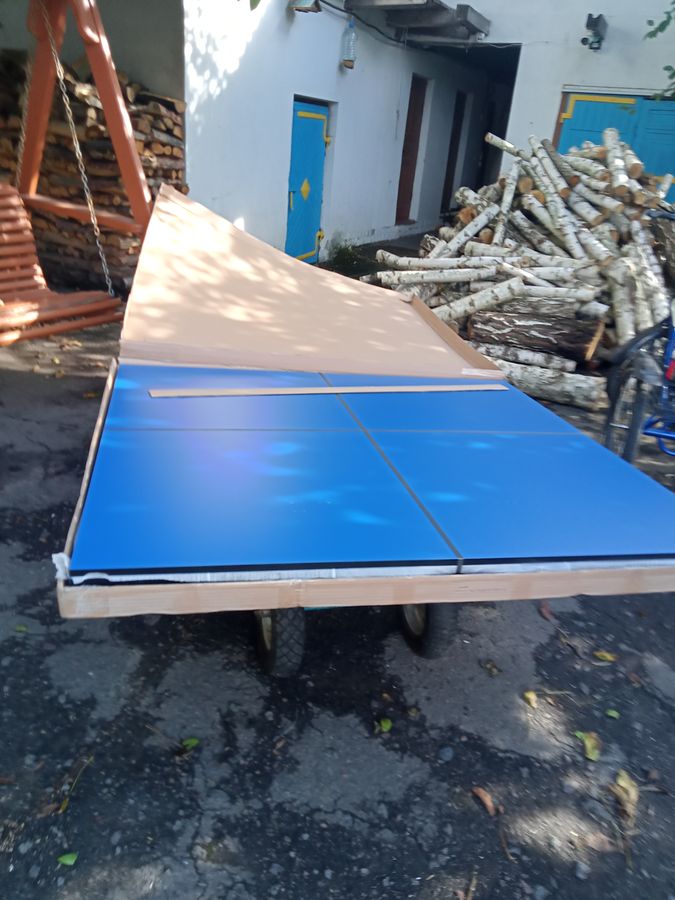 Наприклад, тенісний. Звісно ж, він складався з 2 половин, але розміри такого стола все одно приблизно 150х140х10 см. Вага 61 кг. Тут, як ви розумієте, вже і габарити і вага були такі, що могло щось трапитись у дорозі, але…ніт.