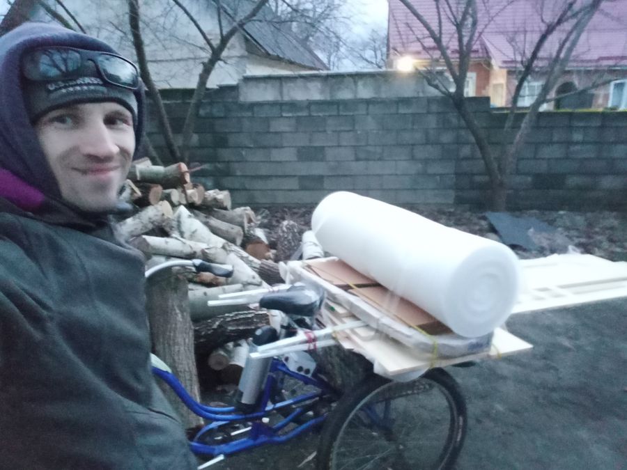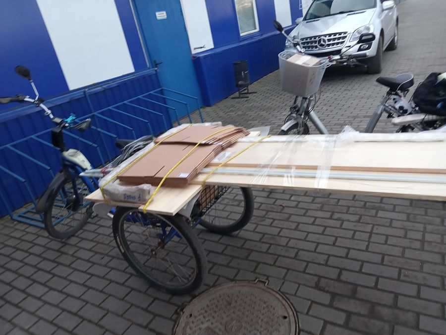 Тут мені дещо потрібна була допомога, бо довжина цього дива складає десь близько 2 метрів, і…як ви розумієте – він почав перекидати ровера назад. Щоб довезти додому цю стільницю (а там була ще й двометрова поличка, десь штук 50 коробок, металеві рейки для цього самого столу і три полички у ванну кімнату). Коротше в той день маршрут співпав так, що я забирав одразу і рейки і стільницю. Відповідно рейками зробив такі собі “ребра жорсткості”, щоб зі “столом” нічого не трапилось в дорозі. Тим цікавіше було везти його, бо рейки, що випирали справа, були таким собі “важелем-ручником”, котрий доводилось увесь час підтримувати по наших дорогах-ямках. Втім, по трішки ми і цей вантаж привезли додому.